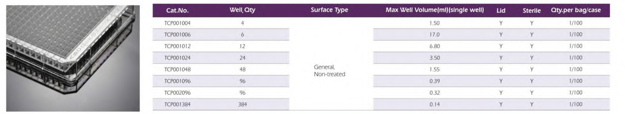 Tissue culture plate 96 well U shape bottom-sterile(100ea/cs)-Jet biofil คุณลักษณะ: -ผลิตจากพลาสติกโพลีไตรีน -แต่ละหลุมมีปริมาตร 0.39 มิลลิลิตรโดยมีทั้งหมด 96 ช่อง -Individual packing -Non treatment - ผ่านการฆ่าเชื้อด้วยรังสีแกมมา (gamma irradiation)